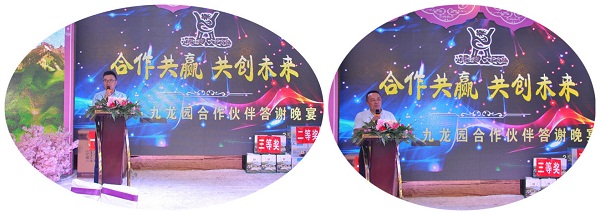 而伴隨著簽約儀式的結(jié)束,晚宴也慢慢的拉開了帷幕… 晚宴開始前九龍園領(lǐng)導與合作伙伴代表分別上臺致辭,雙方都對此次簽約儀式表示肯定,并期待著彼此間未來的合作就像我們的主題一樣“合作共贏,共創(chuàng)未來”!